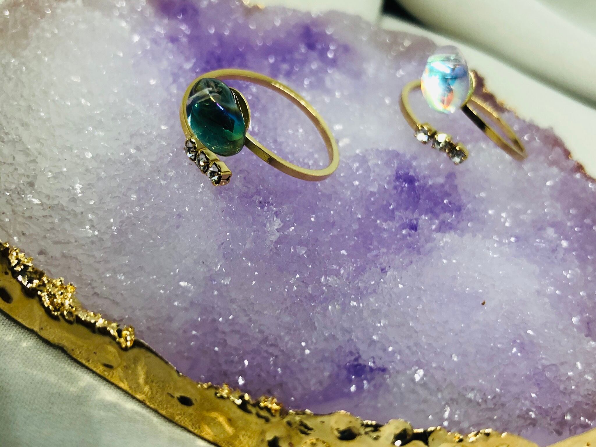 光によって色が変わるオーロラにかかったドロップストーンです。