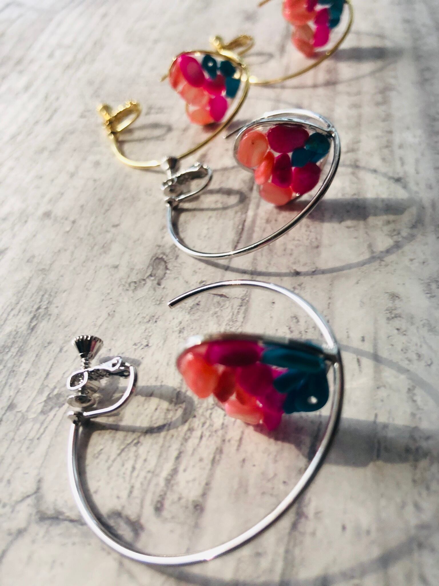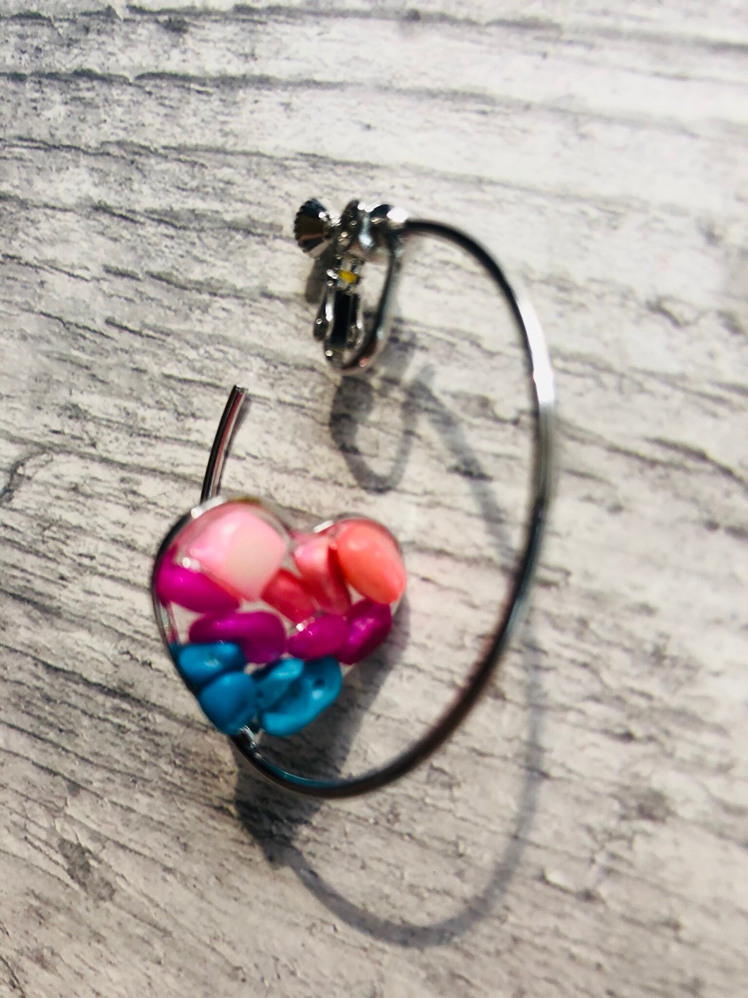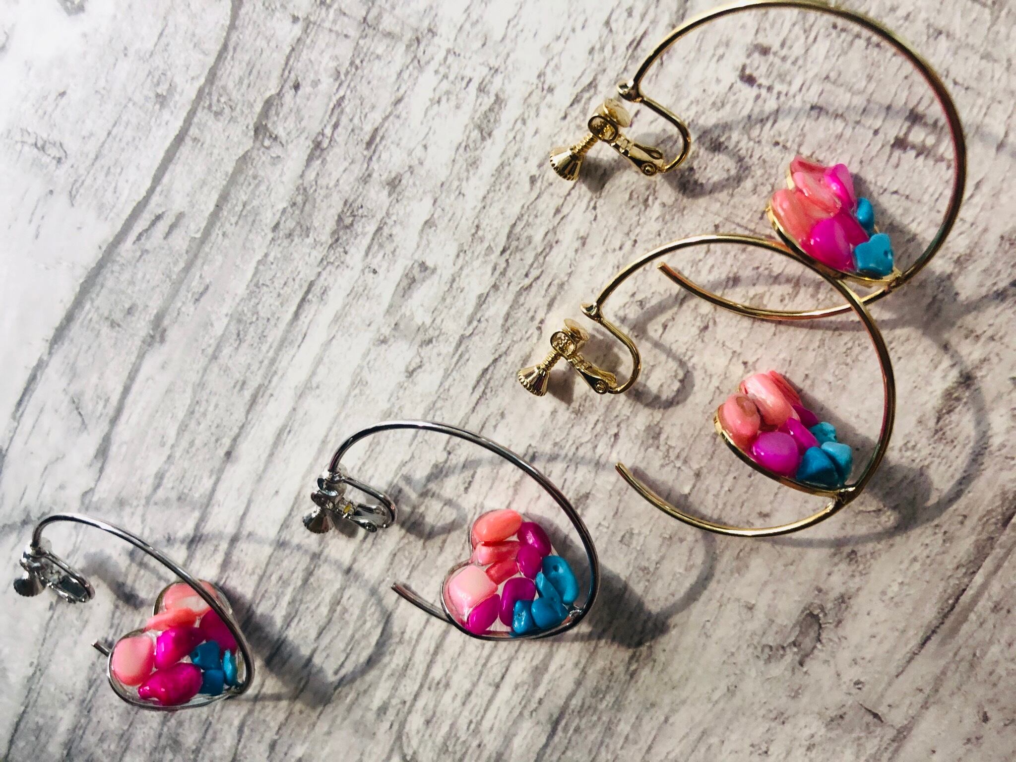 イヤリング ハートの中に天然石を埋めたリングイヤリングになります。 耳たぶが痛くならないようにシリコンカバーをつけて届けさせて頂きます⍤⃝♡